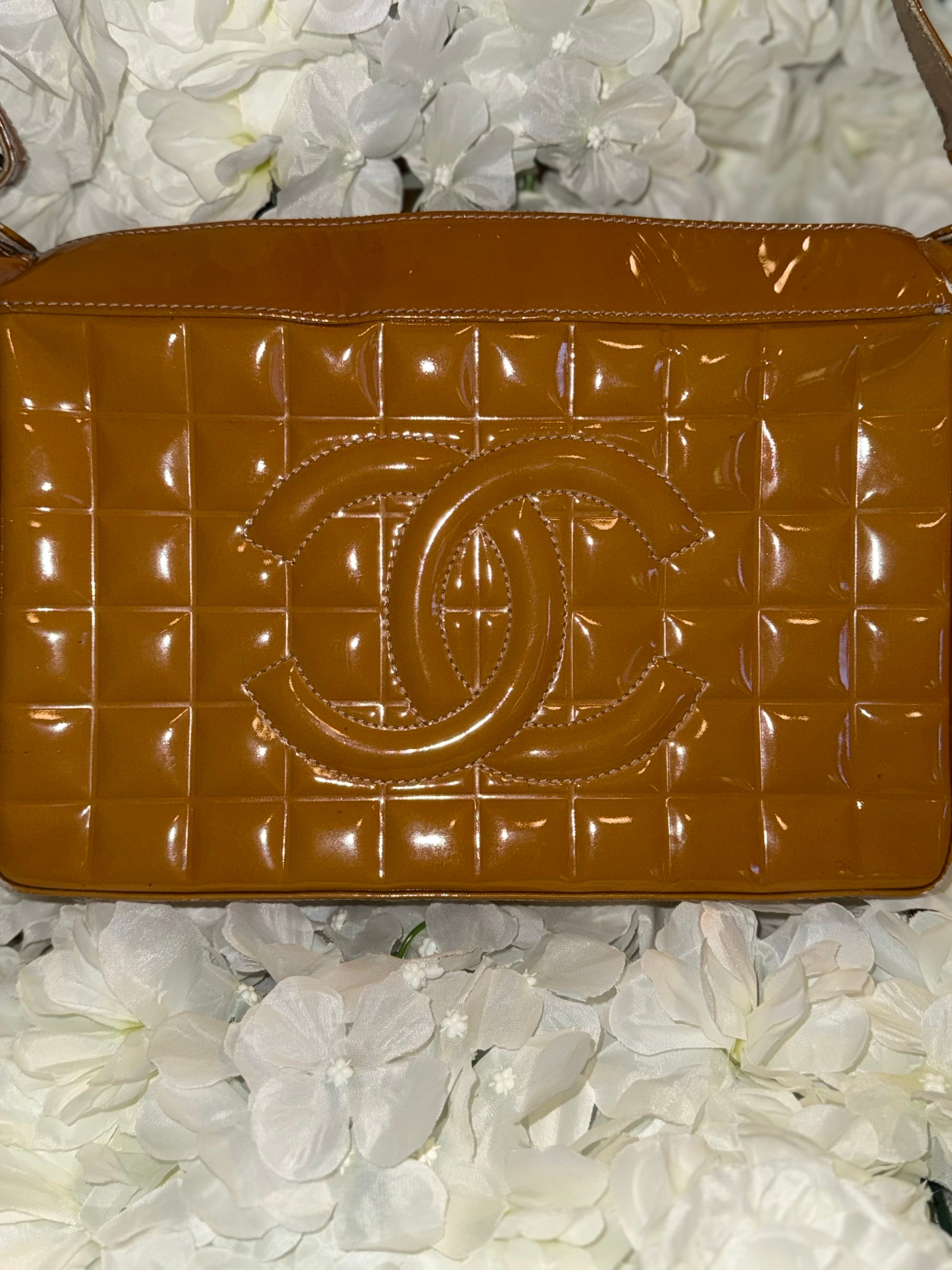 Chanel Mustard Chocolate Bar Handbag Patent Leather Vintage