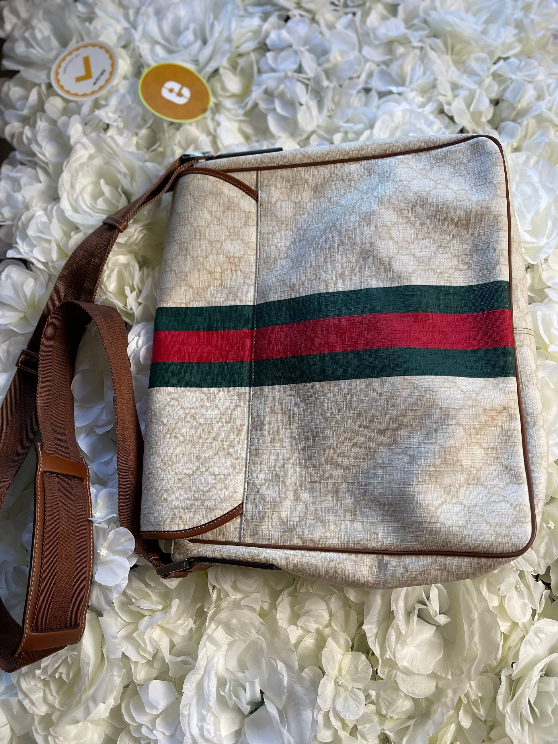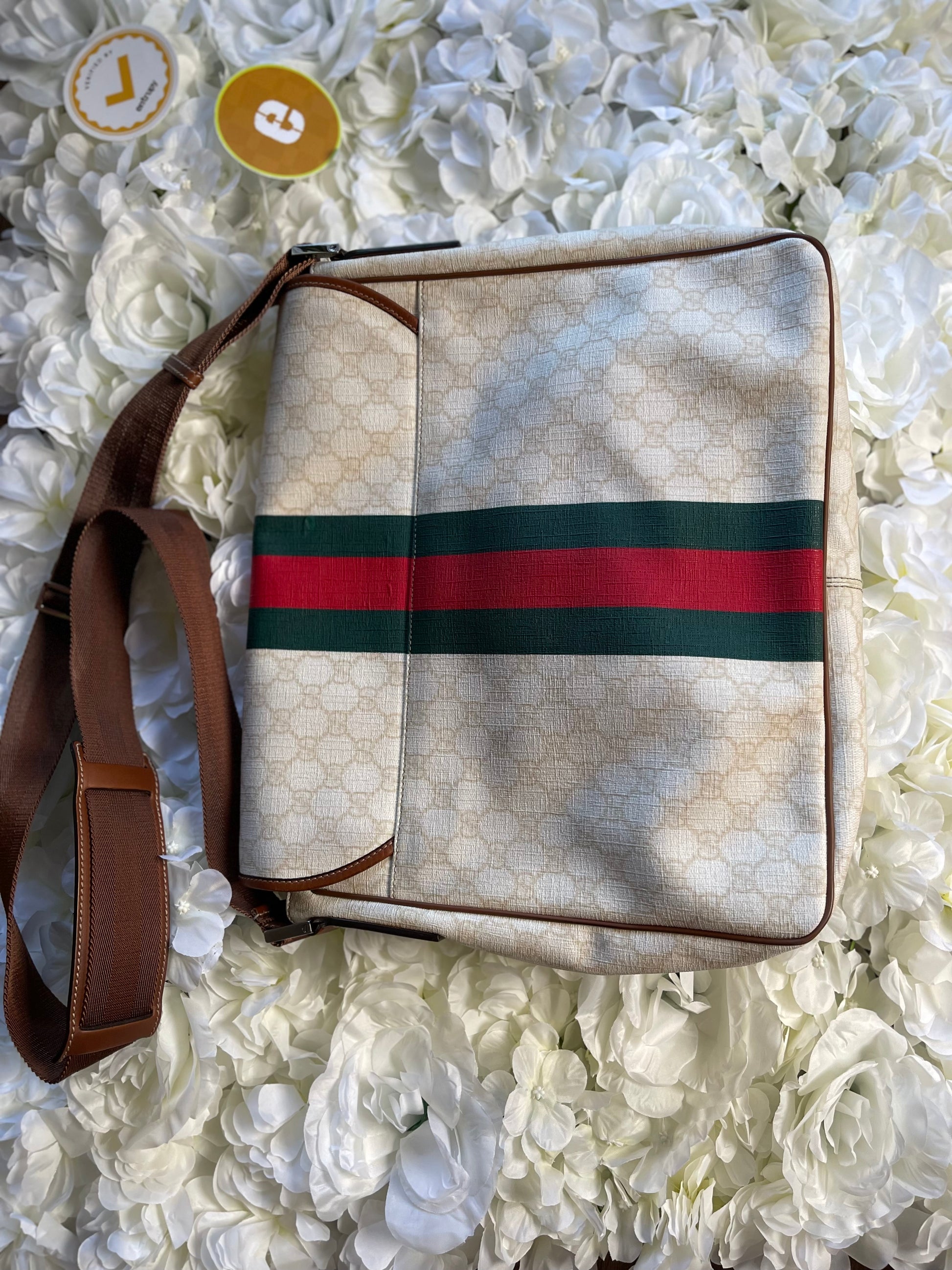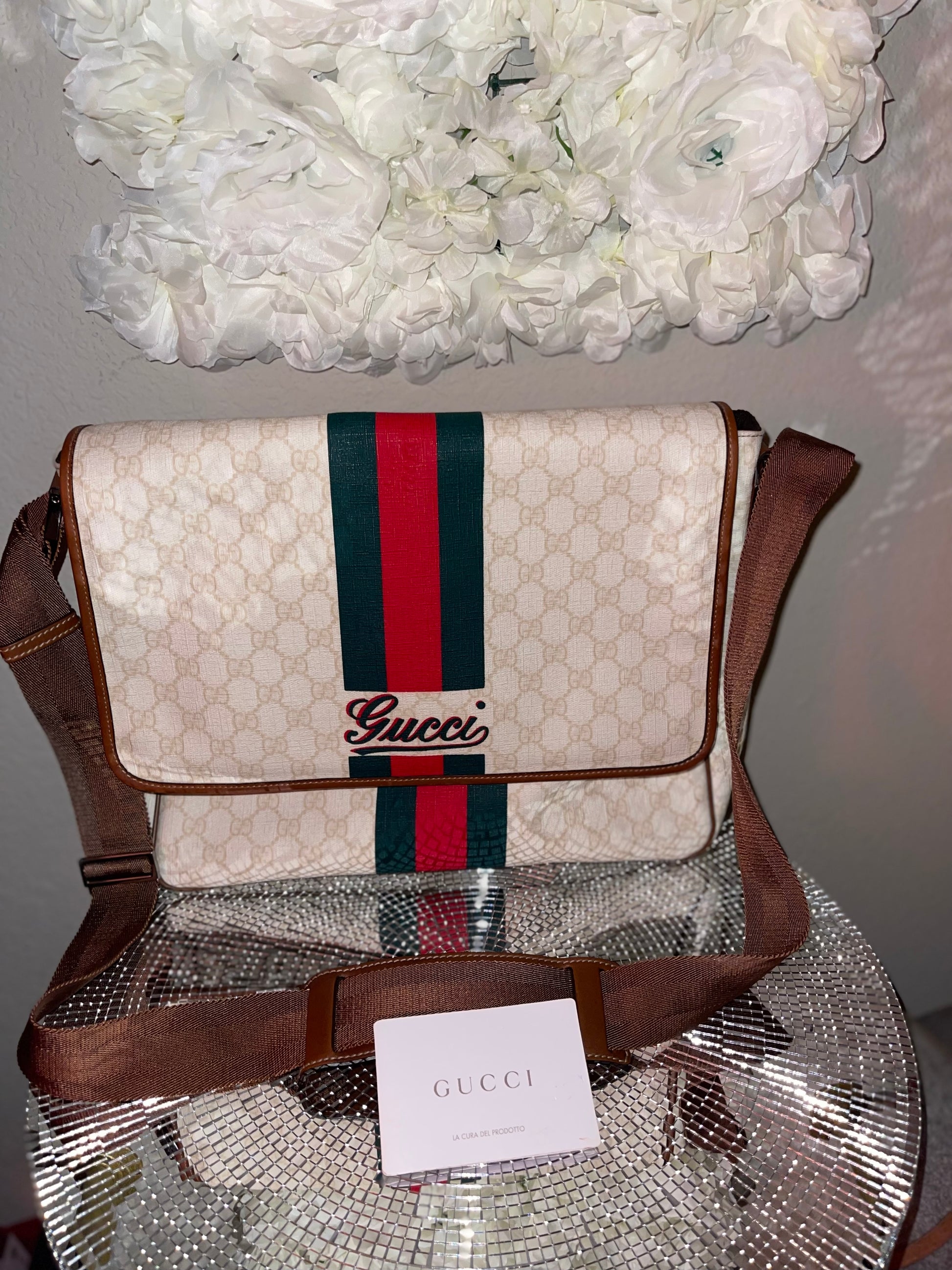 Condition: Excellent. Minimal signs of wear. Clean interior. Exterior has minor stains (see all photos). Minor ripping on front of bag (see photos). No odors. Straps, snap and zipper function properly.