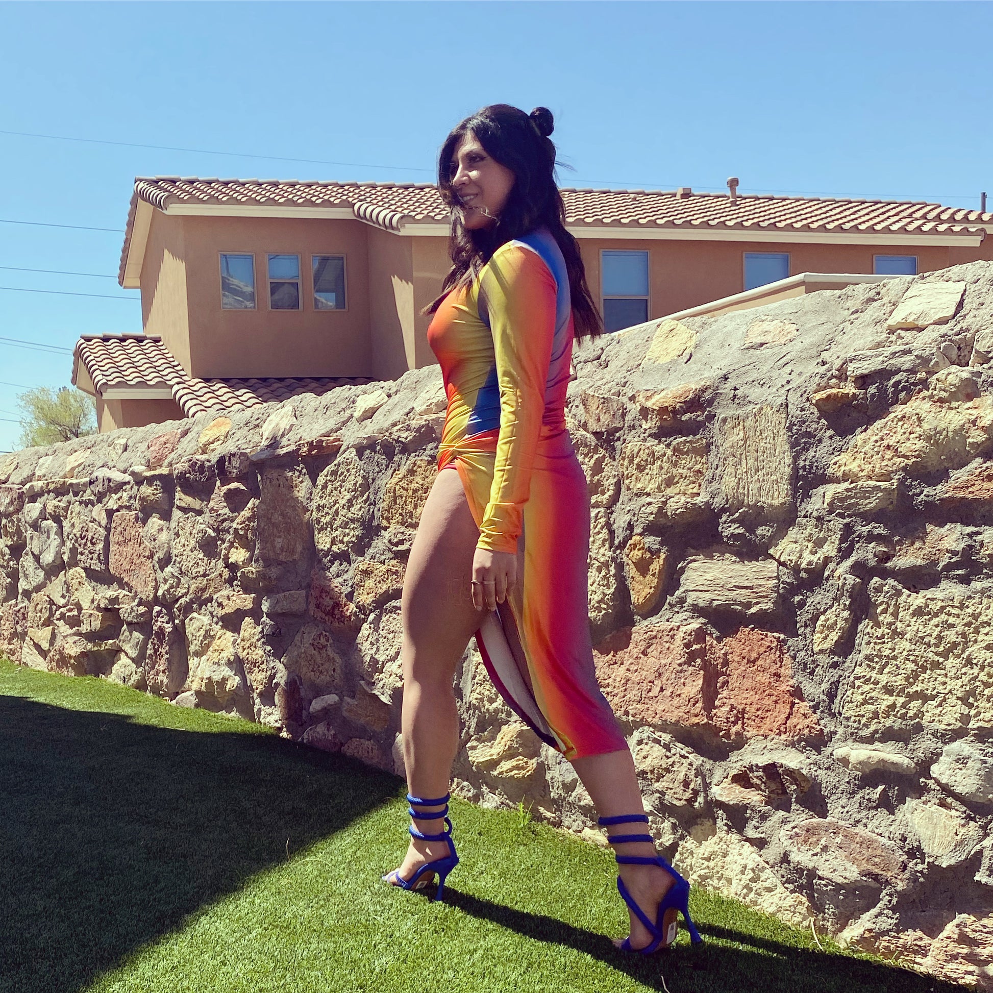 Rainbow, ombré bodysuit with matching skirt. High slit, long sleeve. True to size. Model is wearing size medium.