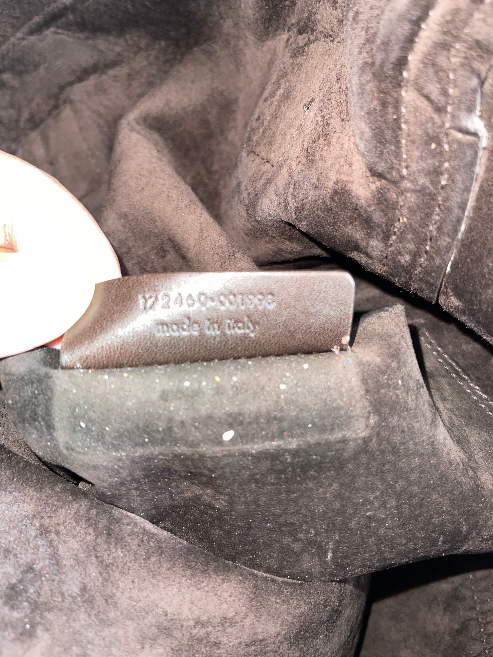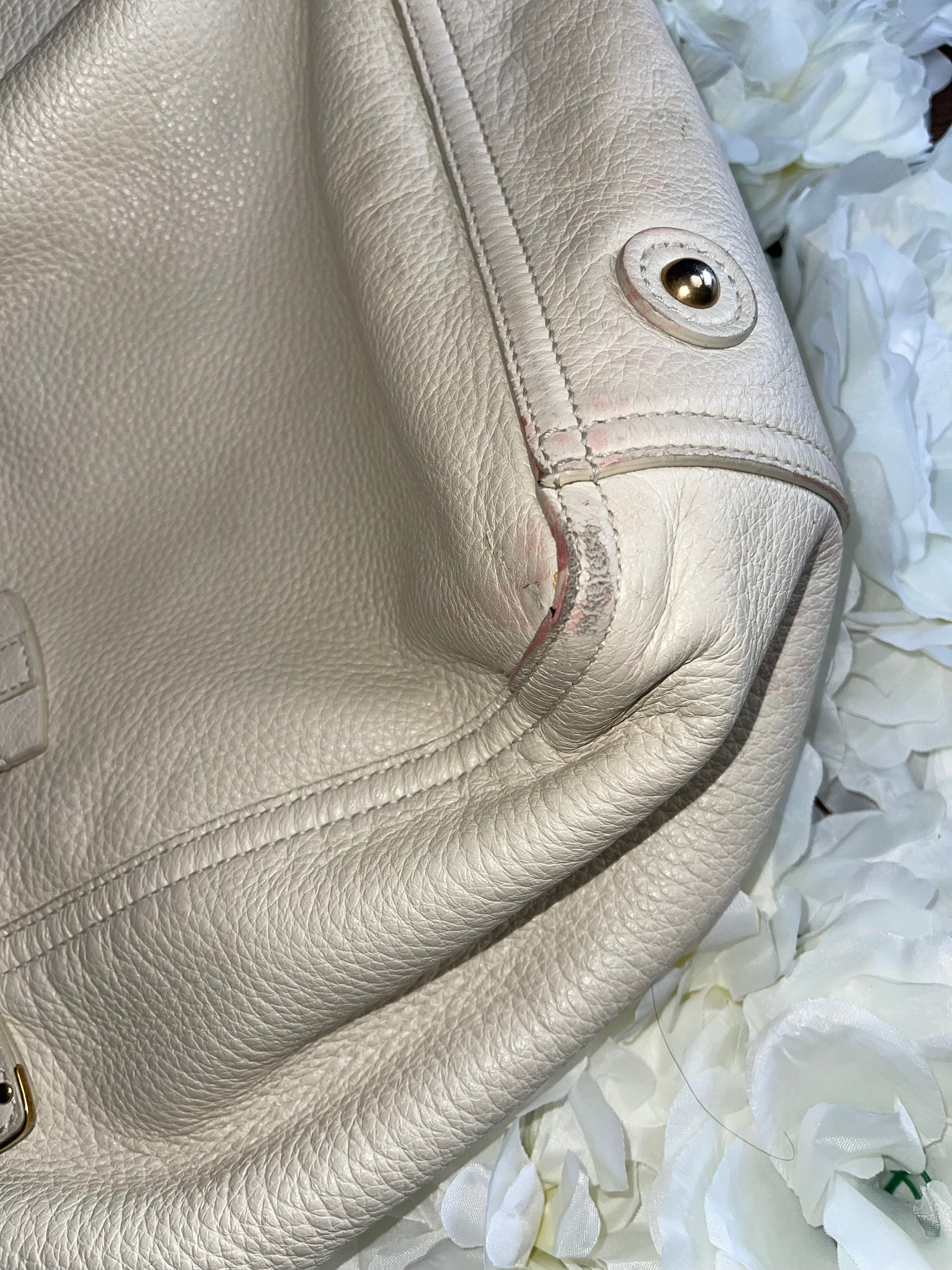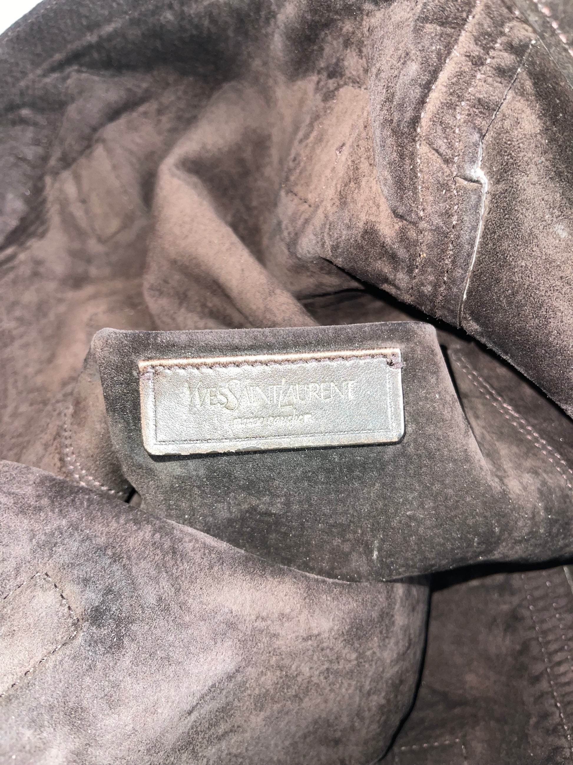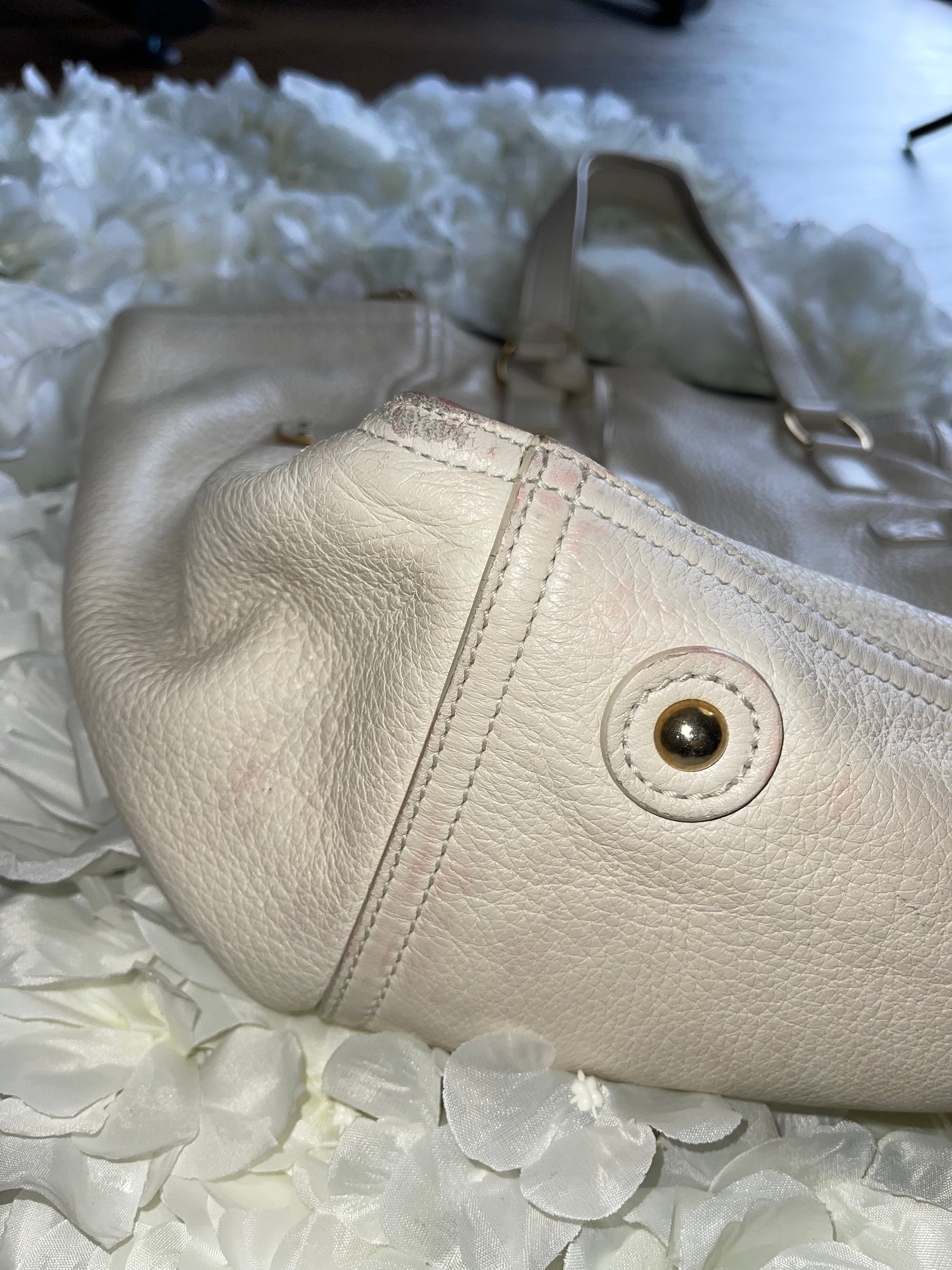 Condition: Fair. Signs of wear and discoloration. Please see all photos for details on flaws. Gold hardware. No smells or odors. Suede interior. Handles show extensive wear (please see all photos).
